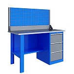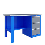 Однотумбовый. Допустимая нагрузка на столешницу 750 кг. Опорные элементы выполнены сварными из холоднокатаной стали. Верстак состоит из столешницы, опоры, тумбы P3 с тремя большими ящиками и полки-стенки. Все металлические элементы покрыты полиэфирной порошковой краской. Столешница состоит из фанеры марки ФСФ толщиной 24 мм, которая покрыта лаком-антисептиком и листом оцинкованной холоднокатаной стали толщиной 1,2 мм. Размеры (ВхШхГ) 855x1396x696 мм.