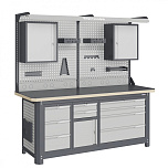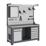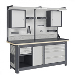 Нагрузка на столешницу 1500 кг. Столешница из листа влагостойкой фанеры марки ФСФ толщиной 40 мм и листом горячекатаной стали толщиной 5 мм. Рама верстака выполнена их холоднокатаной стали. Модуль верстака выполнен сварными. Ящики в модулях устанавливаются на шариковых телескопических направляющих полного выдвижения. Квадратная перфорация для установки крючков, держателей. Размеры: 1982x1493x743 мм