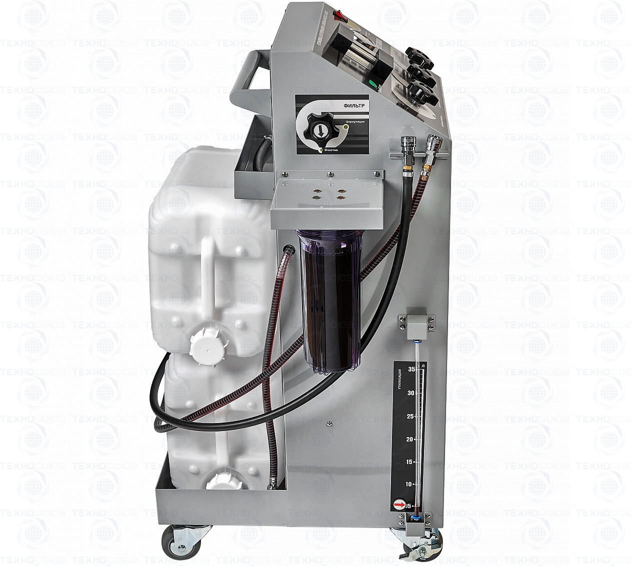 Мощный насос в совокупности с 40 литровым резервуаром для отработанного масла расширяет диапазон применения установки в сегменте спецтехники. Возможно применение внешних емкостей для свежего масла. Контроль давления в магистрали АКПП осуществляется встроенным манометром.
