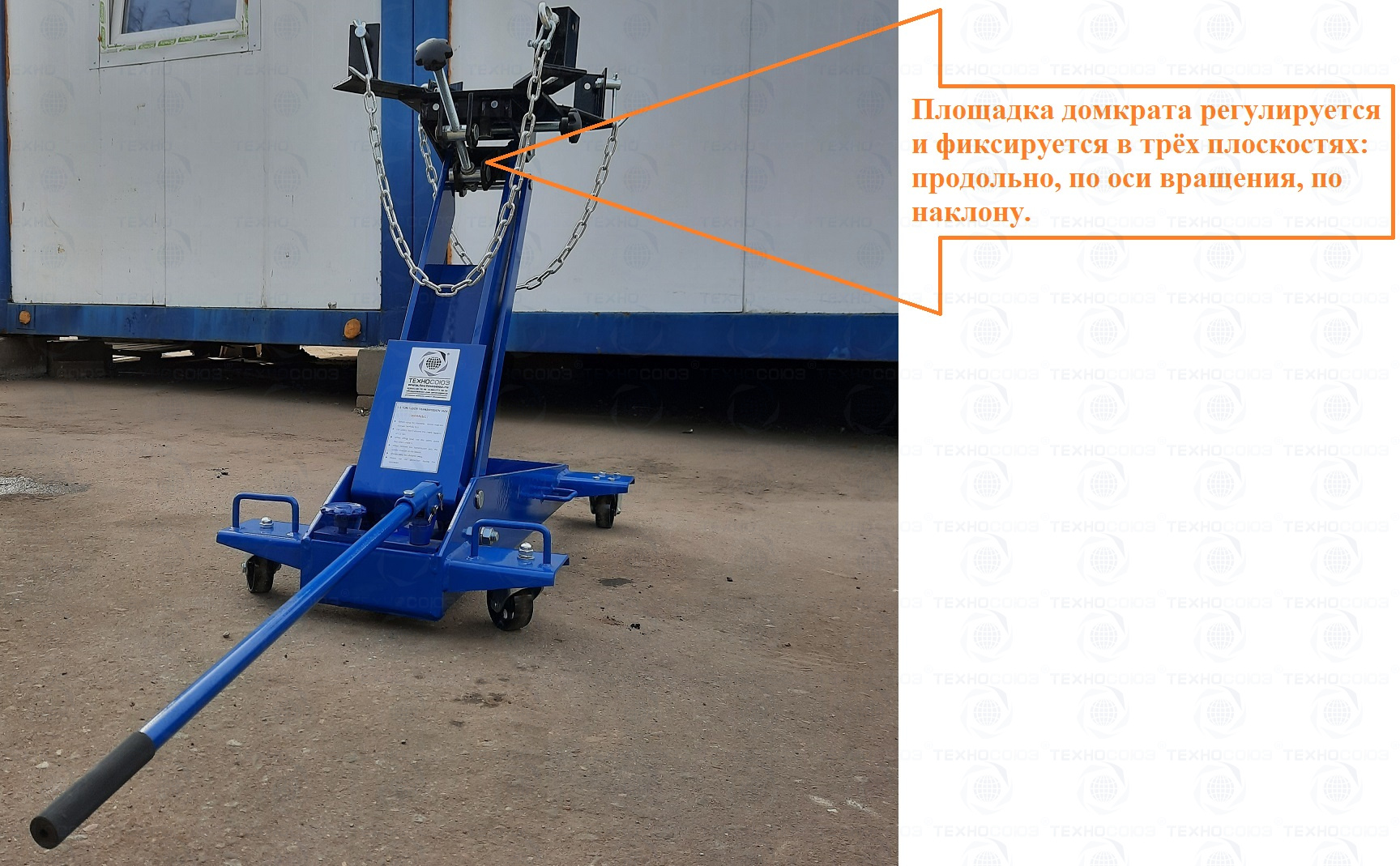 Домкрат трансмиссионный для снятия/установки ОСОБО ТЯЖЕЛЫХ АГРЕГАТОВ (КПП, мостов и т.п.) г/п 1 т. Подъем 230-760 мм. Устойчивый и маневренный – два колеса поворотные. Оборудован страховочной цепью, для фиксации агрегата. Приемная площадка регулируется с фиксацией в трех плоскостях: продольно, по наклону, по оси вращения.
