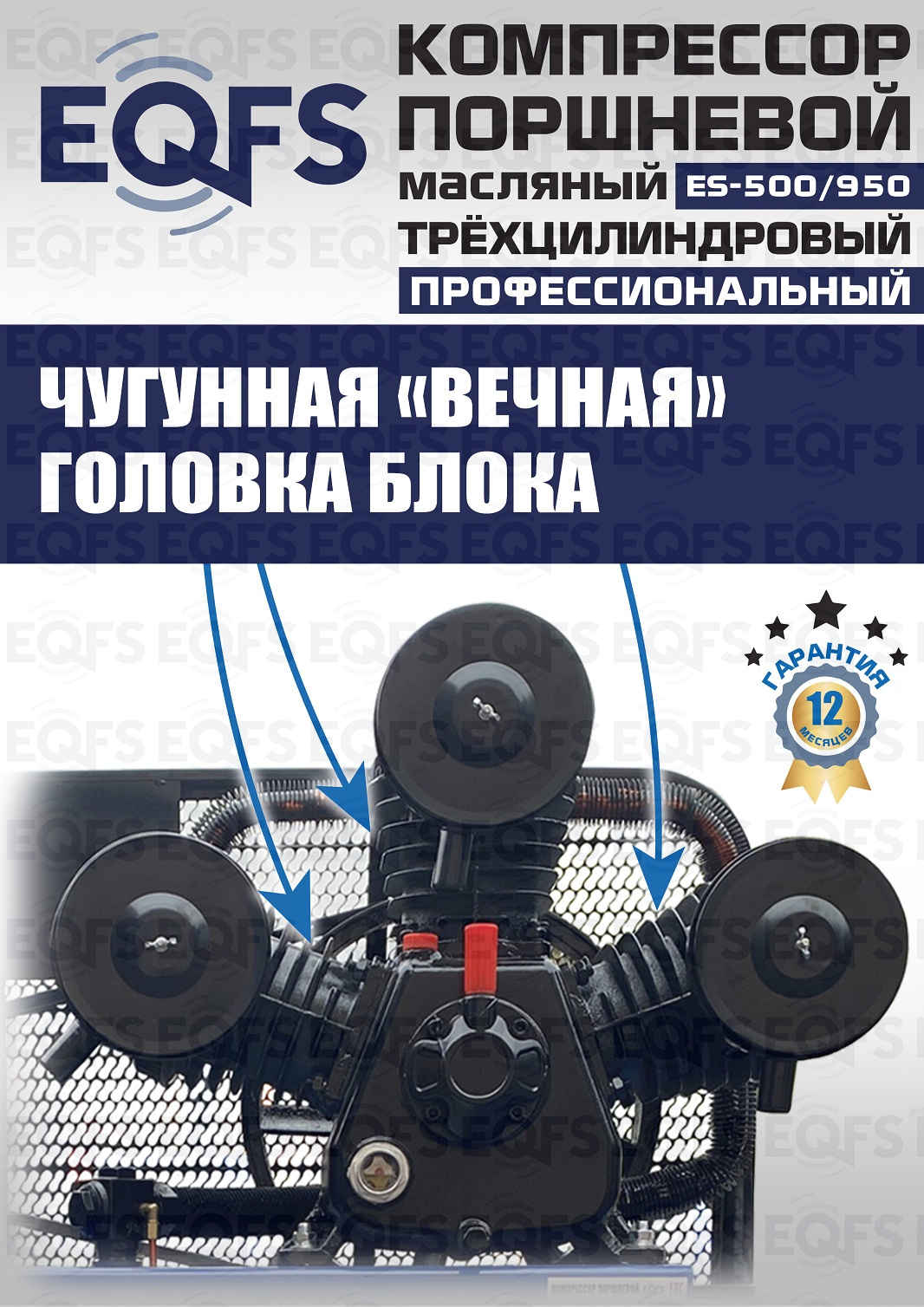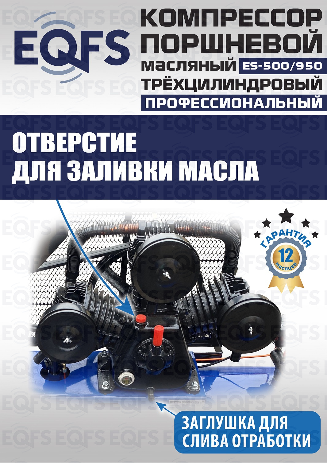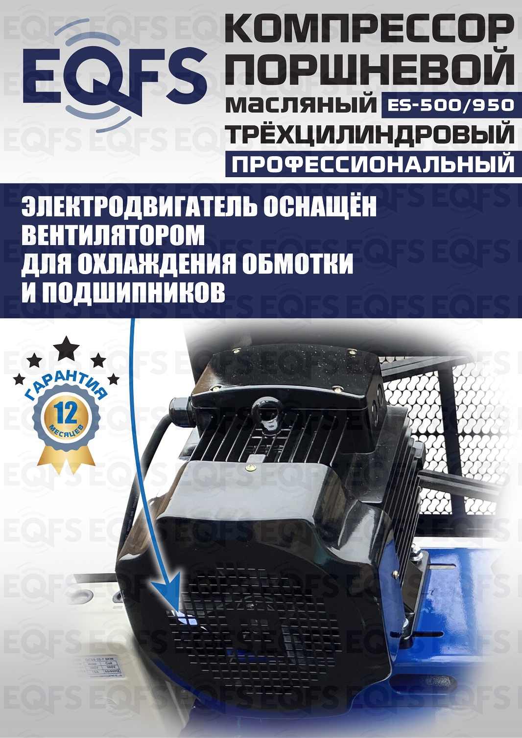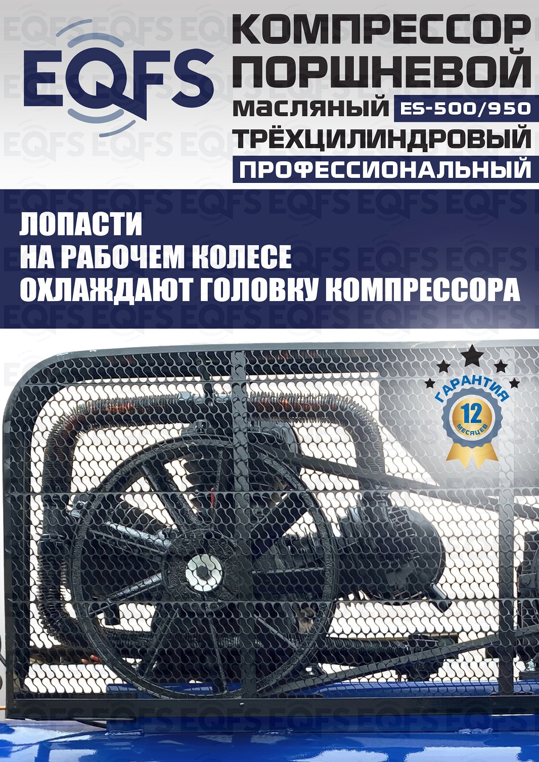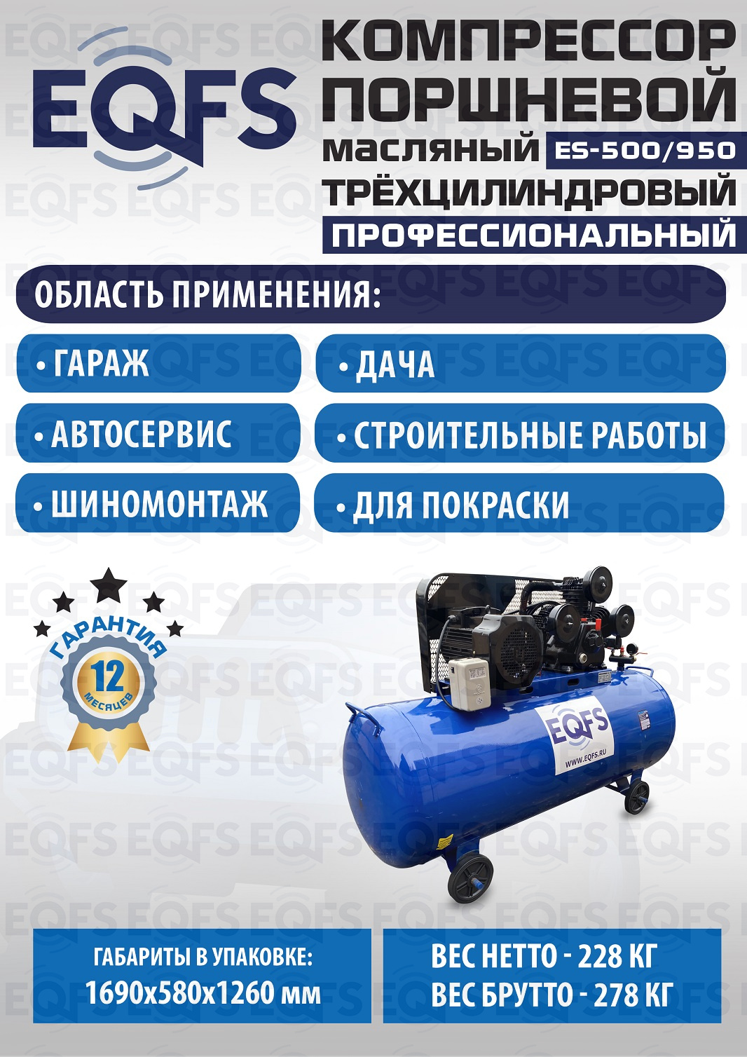 Компрессор воздушный, передвижной, поршневой, масляный, трёхцилиндровый. Быстро достигает нужного давления. Трёхпоршневая головка двигателя уменьшает износ деталей и увеличивает срок службы. Ремённый привод — предохранят мотор от поломки. Идеальное решение для шиномонтажа, автосервиса, строительства, покраски, промышленности. Давление 8 Атм. Производительность 950 л/мин. Мощность 7,45 кВт. Напряжение 380В. Ёмкость ресивера 500 л. Гарантия 12 месяцев.