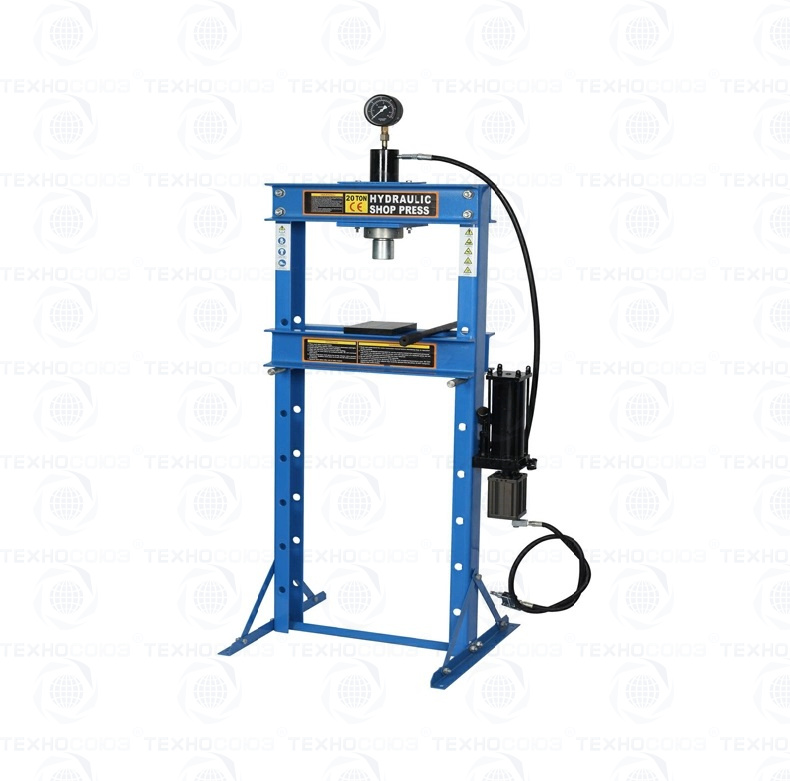 Пресс 20 тонн пневмогидравлический гаражный. Используется для запрессовки деталей машин в гаражах, автосервисах, слесарных цехах по ремонту трансмиссии, ДВС. Контроль усилия – визуально по жидкостному манометру.