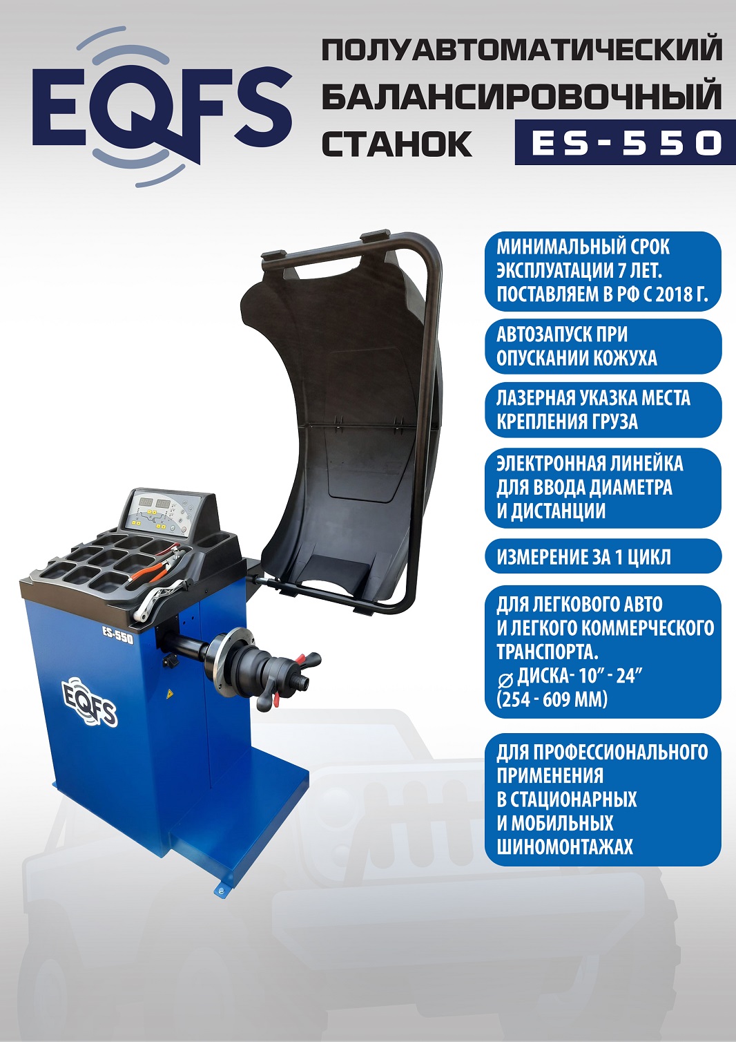 ES-550 Балансировочный станок. Полуавтомат. Удобный и понятный интерфейс. Автозапуск опусканием кожуха. Автоматический ввод дистанции и диаметра диска. Лазерная навигация. Автокалибровка. Для колес легковых автомобилей, мотоциклов, «Газелей», «Спринтеров» с диаметром диска с резиной до 800 мм. Размеры диска: ширина 3–10” (76-254 мм) , диаметр диска 10–24” (254÷609 мм). Вес ≤ 65 кг. Вал- 36 мм. Точность ±1гр. 220 В. Режимы работы DINAMIC, STATIC, ALU1, ALU2, ALU3, ALUS, ST. Гарантия 12 мес. В комплекте: кожух с автозапуском + клещи + кронциркуль + быстрозажимная гайка + набор конусов.