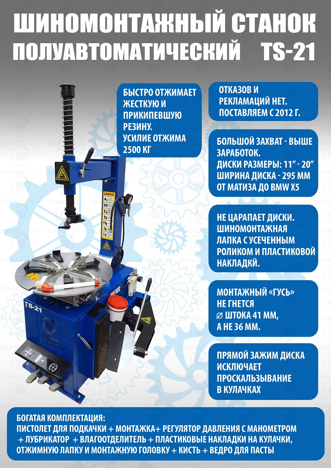 Полуавтоматического шиномонтажного станка TS-21 предназначен для монтажа и демонтажа колес легковых автомобилей, джипов и коммерческой техники. Для дисков: внешний 11÷18”, внутренний 12÷20”. В комплекте: пистолет для подкачки шин + монтажка + пластиковые накладки на зажимные кулачки + регулятор давления с влагоотделителем и манометром. Рекомендуется для постов со средней и высокой проходимостью.