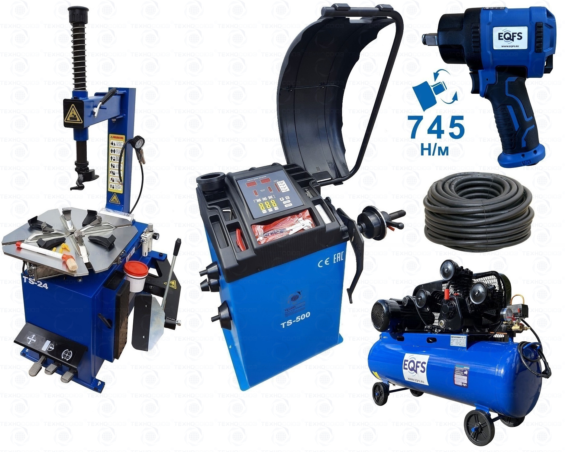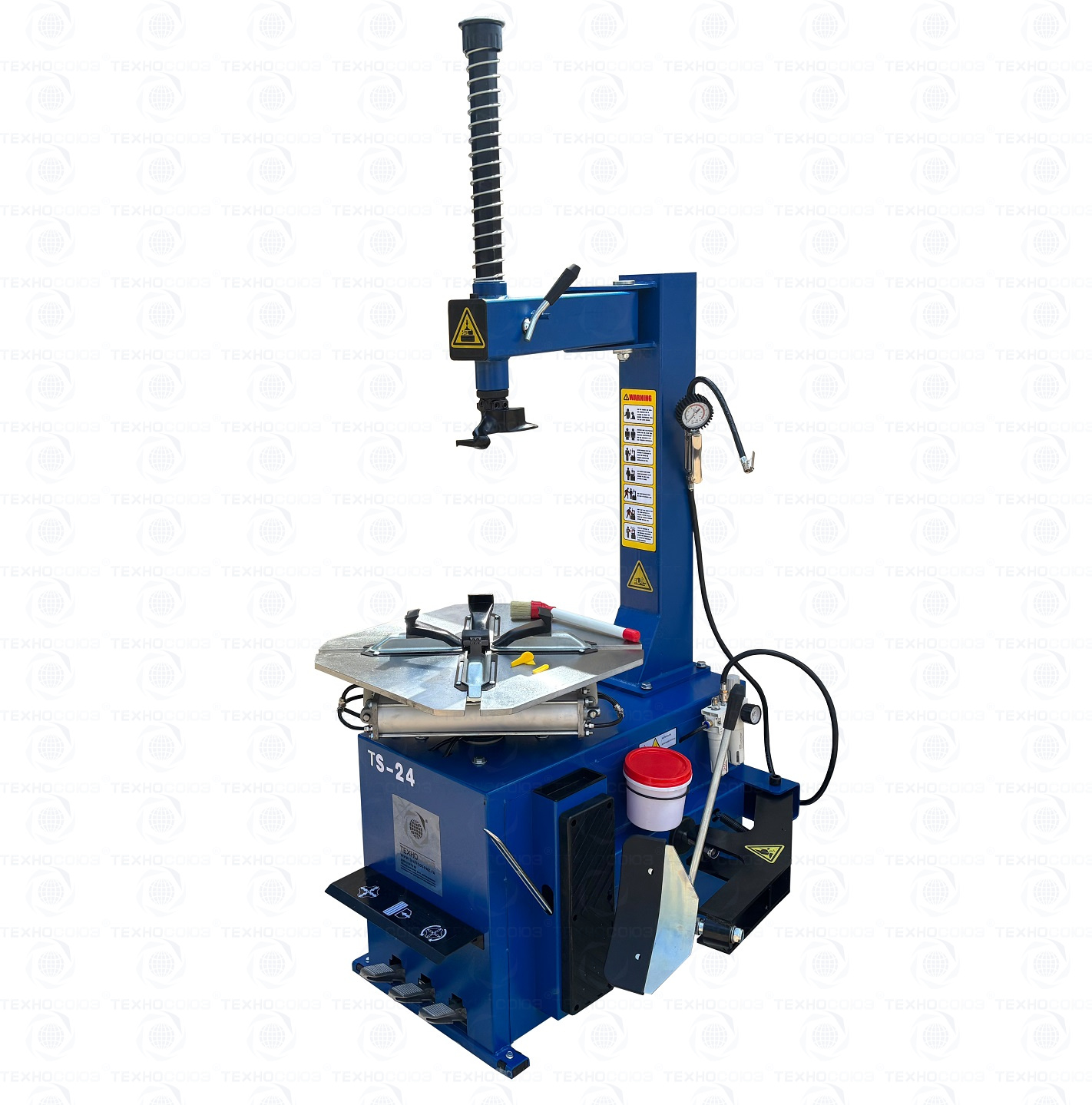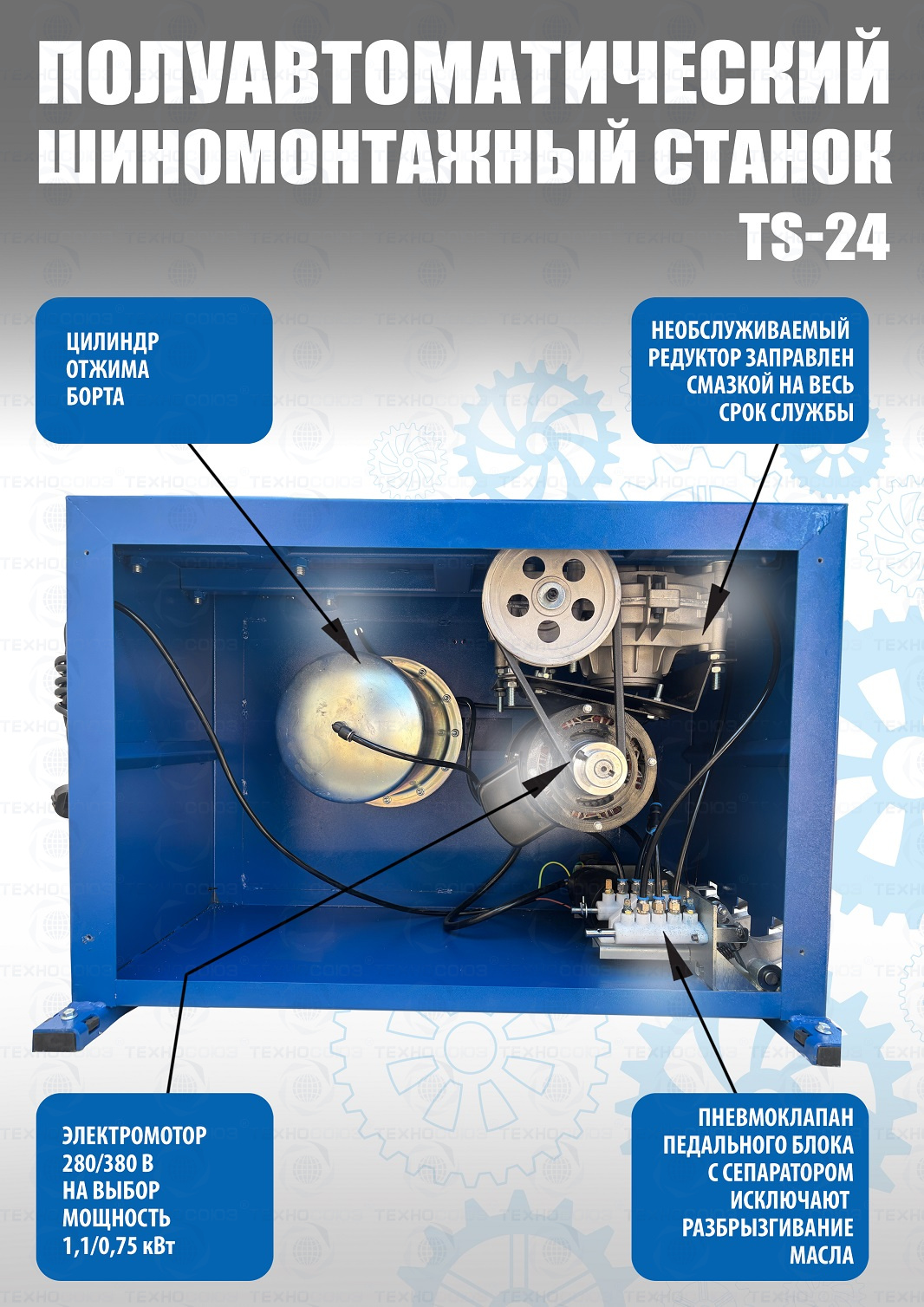 Шиномонтажного станка TS-24. Полуавтоматический. Квадратный стол. Рекомендуется для постов со средней и высокой проходимостью. Для дисков: внешний 11÷21”, внутренний 12÷24”. Усилие отрыва покрышки 2700 кг. В комплекте: пистолет для подкачки шин + монтажка + пластиковые накладки на зажимные кулачки + регулятор давления с влагоотделителем и манометром. Напряжение шиномонтажных станков 220В или 380В на выбор.