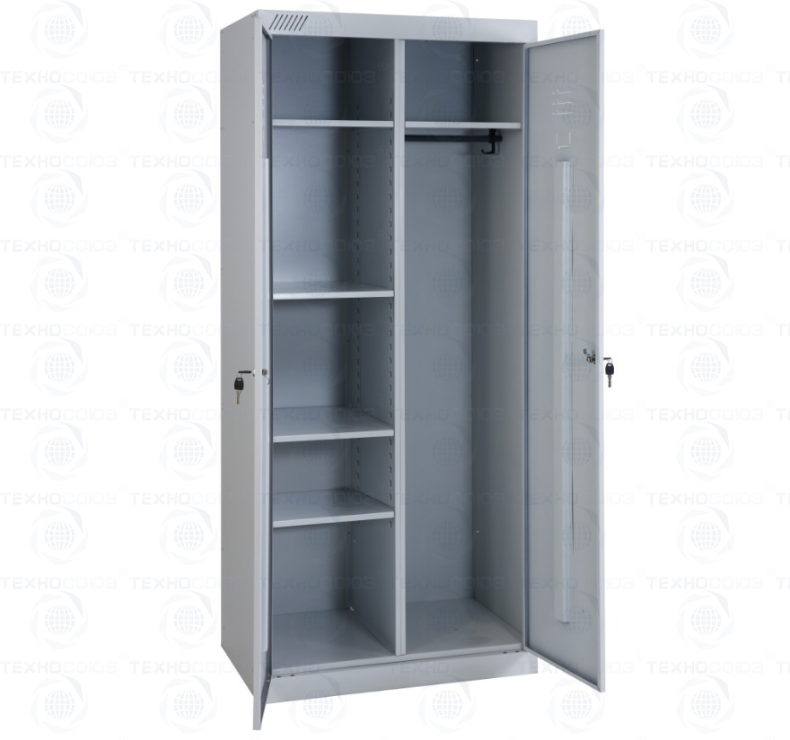 Шкаф металлический сборный двухсекционный. В левом отделении - полка для головных уборов, перекладина, два крючка, замок повышенной секретности. В правом отделении три регулируемых по высоте полки и замок повышенной секретности. Шкаф окрашен порошковой краской светло-серого цвета RAL 7035. Размеры: 1850x800x500 мм.