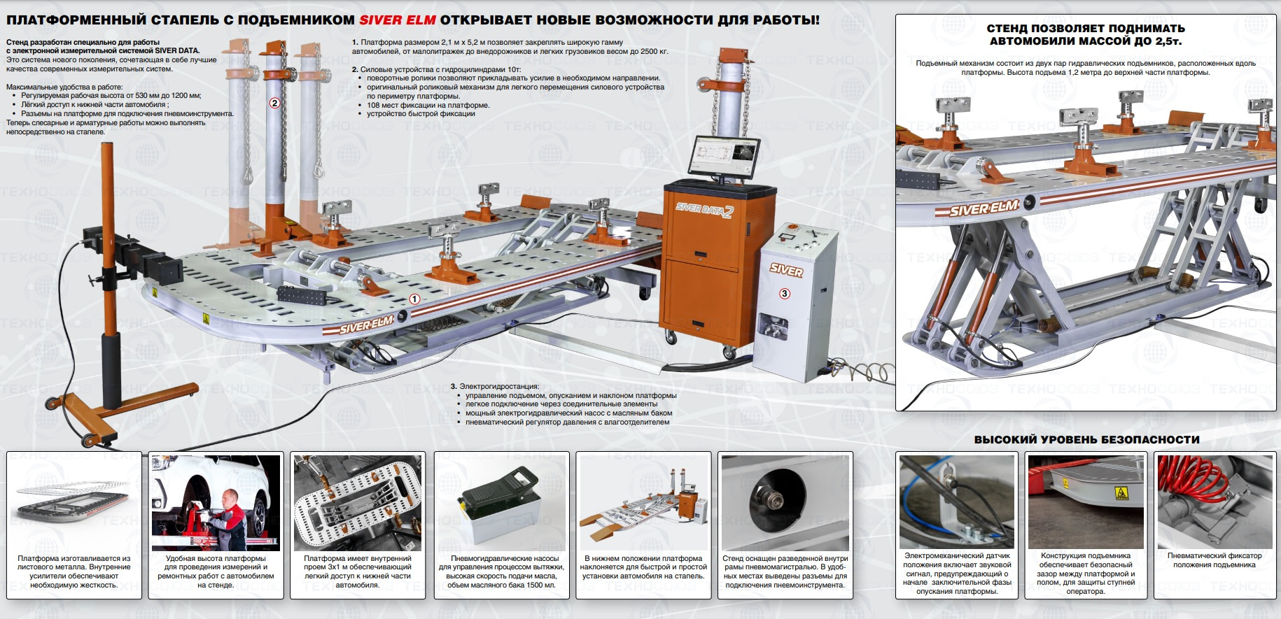 Платформенный стапель с подъемником SIVER ELM открывает новые возможности ремонта! Стенд предназначен для совместной работы с электронной измерительной системой SIVER DATA. Это система нового поколения, сочетающая в себе лучшие качества современных измерительных систем.