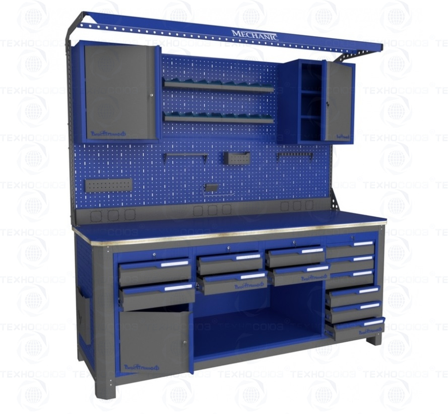 В состав рабочего места входит: Рама (металл 1,5 мм.), столешница (фанера 24 мм. + металл 6 мм.), 2 боковые перфорированные панели, модуль с дверцей и 2-я ящиками, модуль подвесной, полка-стенка, модуль с 6-ю выдвижными ящиками, блок розеток, комплект усиленных кронштейнов, 2 экрана, козырек с лампой освещения, навесной шкафчик, 4 полочки, 16 пластиковых контейнера, держатель универсальный, держатель для баллонов, держатель для ключей, держатель для отверток, держатель для бумажных полотенцев, кармашек.